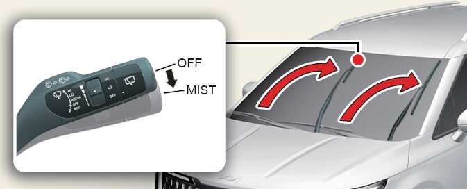 엔진 시동을 끈 후 약 20초 이내에 와이퍼가 최상단으로 올라갈 때까지 와이퍼 스위치를 약 2초 이상 「MIST」 위치로 올리십시오.