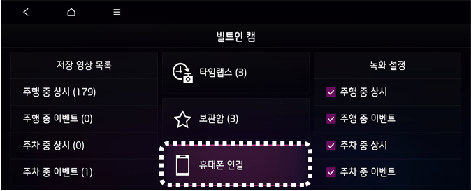 인포테인먼트 시스템 홈 화면에서 빌트인 캠 선택 후, 휴대폰 연결을 선택하여 스마트폰 연결이 가능한 상태로 만드십시오.