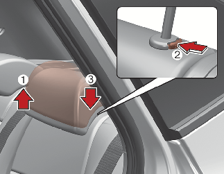 To lower the headrest, push and hold the release button (2) on the headrest support and lower the headrest to the desired position (3).