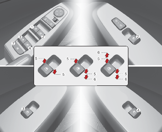 Each door has a power window switch that controls the door's window. The driver has a power window lock switch which can block the operation of rear passenger windows. The power windows can be operated for approximately 3 minutes after the ENGINE START/STOP button or the ignition switch has been placed in the ACC or LOCK/OFF position. If the front doors are opened, the power windows cannot be operated even within the 3 minutes period.