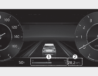 The instant fuel economy (1) and average fuel economy (2) is displayed at the bottom of the cluster.