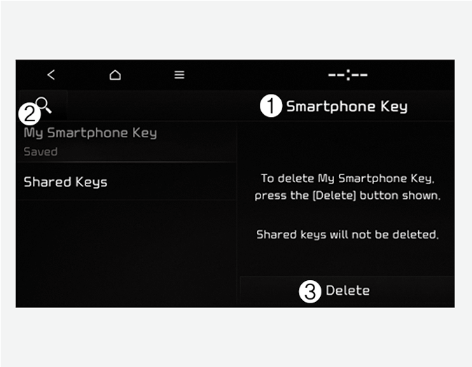 With the vehicle on, touch 'Setup→ Vehicle → Digital Key → Smartphone Key → My Smartphone Key → Delete' on the infotainment system.