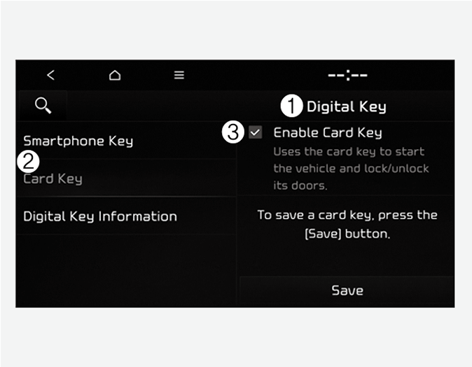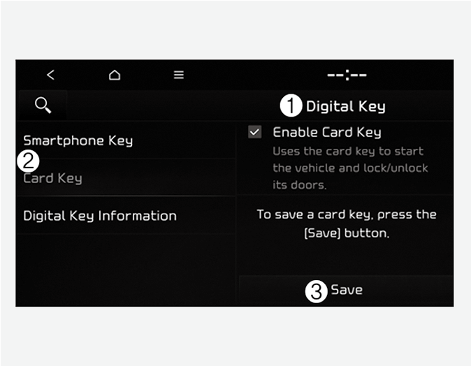 When there is a digital key (card key) already saved in the vehicle, the 'Save' menu is disabled. If you want to save a digital key again, refer to More Details and follow the deleting procedure first before saving a digital key.