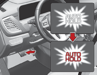 When coming to a complete stop by pressing the brake pedal, the AUTO HOLD indicator changes from white to green indicating the AUTO HOLD is engaged. The vehicle will remain at a standstill even if you release the brake pedal.