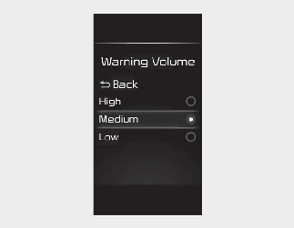 Warning Volume : Select ‘User Settings → Driver Assistance → Warning Volume’ on the LCD display or ‘Setup → Vehicle → Driver Assistance → Warning Methods’ on the Infotainment system.