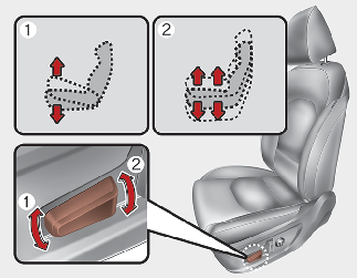 조절 스위치의 앞쪽(1)을 올리거나 내리면 좌석의 앞부분이 올라가거나 내려오고, 조절 스위치의 뒷쪽(2)을 올리거나 내리면 좌석 전체가 올라가거나 내려옵니다.