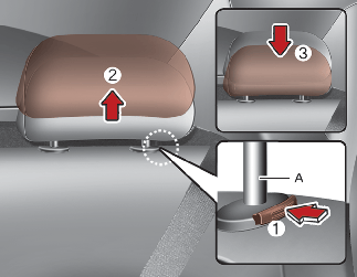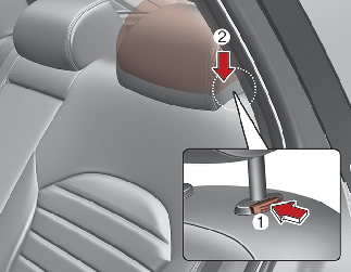 내릴 때는 잠금해제 버튼(2)을 누른 채로 헤드레스트를 위에서 누르십시오(3).