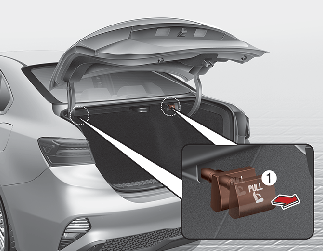 트렁크에 위치한 좌석 접이 레버(1)를 당긴 면 좌석 등받이가 앞으로 접힙니다.