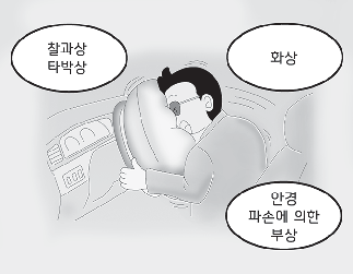 에어백이 작동되면 스티어링 휠과 인스트루먼트 패널의 에어백 관련 부품은 매우 뜨거워 집니다. 부상을 방지하기 위하여 에어백이 부풀어 오른 후에 에어백 내장 부분을 바로 만지지 마십시오.