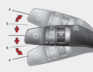 차량의 이동 방향을 예고하기 위해 사용하십시오. 우측 방향을 표시하려면 조명 스위치를 위(A)로, 좌측 방향을 표시하려면 아래(A)로 움직이십시오.