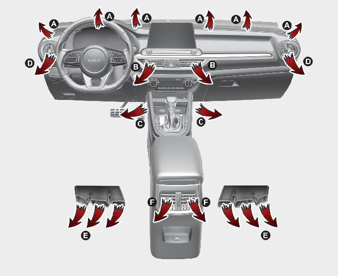 주로 발끝으로 바람이 나오게 할 때 사용합니다. (일반적으로 난방을 할 때의 위치입니다.) 앞유리 습기 발생 예방 차원에서 (A), (D) 방향에서도 약간의 바람이 나옵니다. |