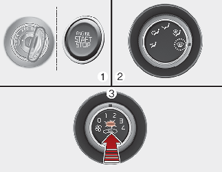 앞유리 서리 제거 기능을 설정 후 10초 안에, 내/외 공기 선택(실내 순환) 버튼을 3초 이내에 5회 이상 누르십시오.