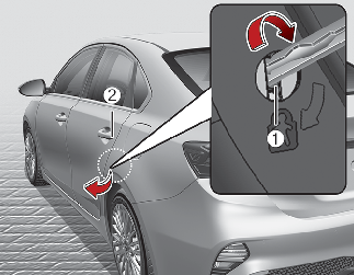 뒷도어를 열 때는 차 밖에서 손잡이(2)를 당겨 여십시오.