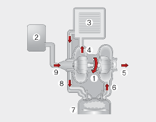 * Turbo Charger(터보차저): 엔진의 흡입공기를 터빈으로 압축시켜 강제로 높은 밀도의 흡기를 공급하는 장치
