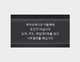 운전자가 안전벨트 미착용 상태이거나 운전석 도어가 열린 상태, 「D」위치에서 엔진 후드가 열린 상태 또는 「R」위치에서 트렁크/테일게이트가 열린 상태에서 시스템 작동 조건 불만족으로 자동 해제가 되지 않을 때, LCD 표시창에 경고 문구가 나타나고 경고음이 1회 울립니다.
