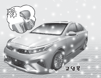 매우 추운 날씨의 주정차 시 주차 브레이크를 작동시켜 놓으면 브레이크 장치가 얼어 붙어버릴 우려가 있으므로 주차 브레이크는 가능한 풀어 놓은 상태에서 주차하십시오. 경사없는 평지에 변속 레버를 「P」 (주차) 위치로, 타이어에는 고임목을 받쳐 차가 움직이지 않도록 하십시오.