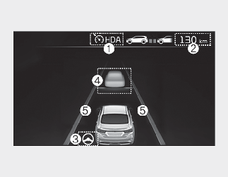 고속도로 주행 보조 표시등, 전방 차량 유무 및 설정된 차간거리 단계가 표시됩니다.