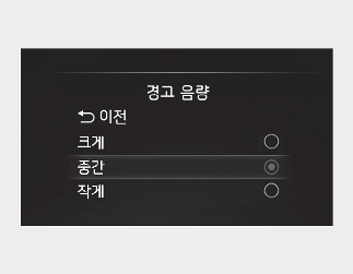 경고 음량: 시동 'ON' 상태에서 클러스터의 사용자 설정 → 운전자 보조 → 경고 음량 또는 인포테인먼트 시스템의 설정 → 차량 → 운전자 보조 → 경고 방식 → 경고 음량에서 변경할 수 있습니다.