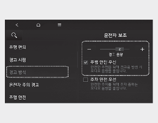 주행 안전 우선: 인포테인먼트 시스템의 설정 → 차량 → 운전자 보조 → 경고 방식 → 주행 안전 우선을 설정하면 안전한 주행을 위해 경고음 발생 시 오디오 음량을 줄입니다.