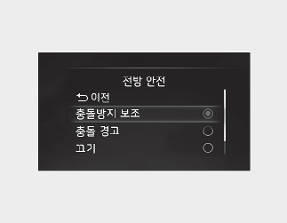 시동 「ON」 상태에서 설정 메뉴의 운전자 보조 → 전방 안전에서 각 기능의 사용 여부를 선택하실 수 있습니다.