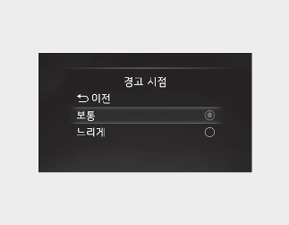 경고 시점을 보통으로 설정해도 전방 차량이 급제동하는 경우에는 경고가 느리게 느껴질 수 있습니다.