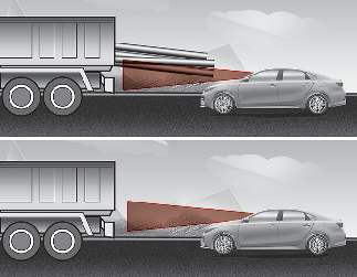 차고가 높은 차량 또는 적재물이 차량 후면으로 돌출되어 있는 경우 위험 상황이 발생할 수 있으니, 항상 전방 도로 상황 및 주행 상태를 확인하시고 주의하여 운전하십시오. 필요하면 브레이크 페달을 밟아 직접 속도를 조절하거나 스티어링 휠을 조작하십시오.