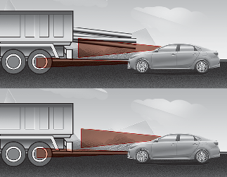 차고가 높은 차량 또는 적재물이 차량 후면으로 돌출되어 있는 경우, 위험 상황이 발생할 수 있습니다. 항상 전방 도로 상황 및 주행 상태를 확인하시고 주의하여 운전하십시오. 필요하면 브레이크 페달을 밟아 직접 속도를 조절하거나 스티어링 휠을 조작하십시오.