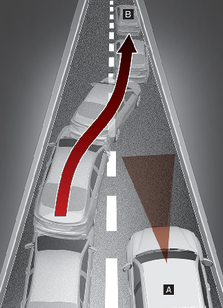옆 차로의 차량(B)이 자차(A)와 같은 차로로 차로 변경을 할 때 센서의 감지 범위 안으로 들어올 때까지 전방의 차량(B)을 인식하지 못할 수 있습니다. 갑자기 끼어드는 차량은 센서가 늦게 인식할 수 있습니다. 항상 전방 도로 상황 및 주행 상태를 확인하시고 주의하여 운전하십시오. 필요하면 브레이크 페달을 밟아 직접 속도를 조절하거나 스티어링 휠을 조작하십시오.