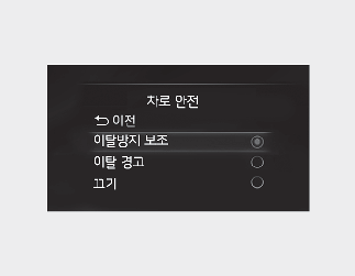 ‘이탈 경고’를 선택하면 차로를 이탈할 경우 경고음이 울리고 조향을 도와주지 않으므로 운전자가 직접 스티어링 휠을 조작해야 합니다.