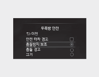 ‘충돌방지 보조’를 선택하면 충돌 위험 상황에 따라 경고음이 울리고, 제동을 보조하여 충돌하지 않게 도와줍니다.