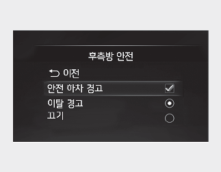 시동 「ON」 상태에서 설정 메뉴의 「운전자 보조 → 후측방 안전 → 안전 하차 경고」를 선택하면 기능이 켜집니다. 기능을 끄고 싶으면 선택을 해제해야 합니다.