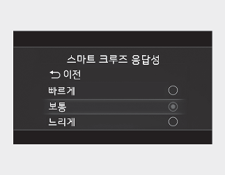 시동 「ON」 상태에서 설정 메뉴의 「운전자 보조 → 스마트 크루즈 응답성」 에서 스마트 크루즈 컨트롤의 가속하는 정도를 설정할 수 있습니다.