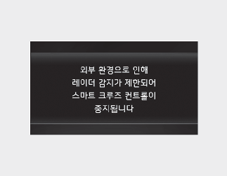 인식 센서 경고문이 표시되지 않거나 경고등이 켜지지 않더라도 스마트 크루즈 컨트롤이 정상 작동되지 않을 수 있습니다.