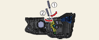 • To aim the low beam left or right, turn the screwdriver (1) clockwise or counterclockwise. To aim the low beam up or down, turn the screwdriver (2) clockwise or counterclockwise.