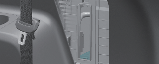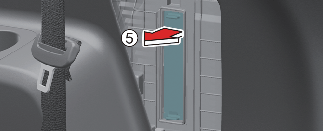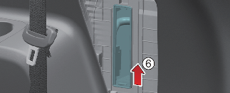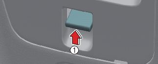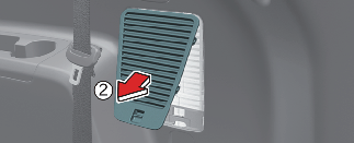 테일게이트 우측에 있는 후석 에어컨 전용 에어필터 커버의 후크(1)를 위로 밀어 누르십시오. 이 상태에서 커버를 앞으로 당겨 분리하십시오(2).