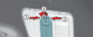 커버를 제거한 상태에서 후석 에어컨의 에어필터 받침대 커버의 상단 후크(3)를 누르면서 잡아당겨 분리하십시오(4).