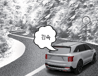 커브가 있는 길을 주행할 때는 브레이크를 밟거나 기어를 변속하지 말고, 미리 속도를 줄인 후, 가능한 한 차체를 똑바로 유지하면서 도십시오.