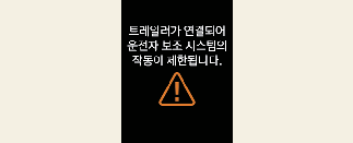 안전한 주행을 위하여 트레일러 커넥터를 차량에 연결하면 클러스터에 경고문이 표시되고 일부 운전자 보조 시스템 작동이 중지됩니다. 트레일러 커넥터를 분리하면 중지된 운전자 보조 시스템이 이전 설정으로 다시 작동합니다.(자사 전용 부품 적용 시)