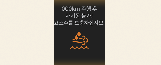 )과 함께 "요소수가 고갈되어 재시동이 불가합니다" 경고 메시지가 표시되며, 이때는 신속히 요소수를 보충하십시오. 요소수 보충 없이 주행하면 요소수 부족으로 재시동 시 시동이 걸리지 않을 수 있습니다. 주행 습관 및 도로