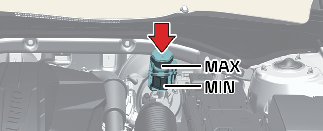 브레이크액 탱크의 액량이 「MAX」보다 초과되었다면 운전 도중 브레이크액이 흘러넘쳐서 주변 부품의 손상을 가져올 수 있으므로 브레이크액 보충 시 브레이크액량이 「MAX」를 초과하지 않게 주의하십시오.