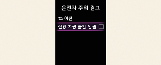 시동「ON」상태에서 클러스터의 사용자 설정 → 운전자 보조 → 운전자 주의 경고 또는 인포테인먼트 시스템의 설정 → 차량 → 운전자 보조 → 운전자 주의 경고를 차례로 선택하십시오.