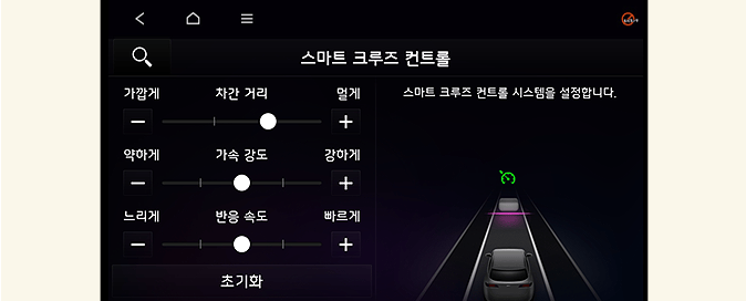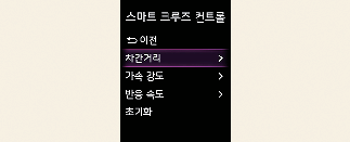 시동 「ON」 상태에서 클러스터의 사용자 설정 → 운전자 보조 → 스마트 크루즈 컨트롤 또는 인포테인먼트 시스템의 설정 → 차량 → 운전자 보조 → 스마트 크루즈 컨트롤을 차례로 선택하십시오. 차간거리, 가속 강도, 반응 속도를 개별적으로 설정할 수 있습니다.