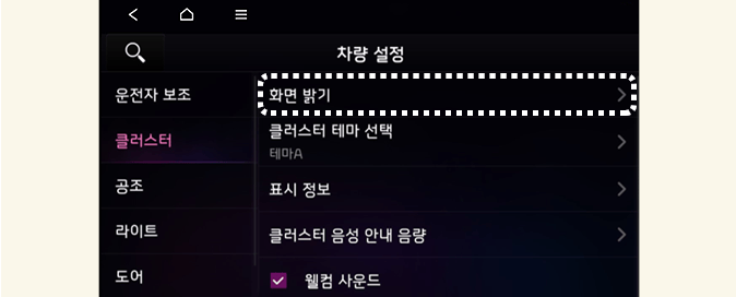 시동「ON」상태에서 클러스터의 사용자 설정 → 라이트 → 조명밝기 조절 또는 인포테인먼트 시스템의 설정 → 차량 → 클러스터 → 화면 밝기를 차례로 선택하십시오.