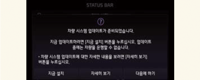 시동을 걸고 주행할 수 없습니다. 업데이트를 위한 충분한 시간을 확보하고, 안전한 장소에 주차한 후에 업데이트를 진행하십시오.
