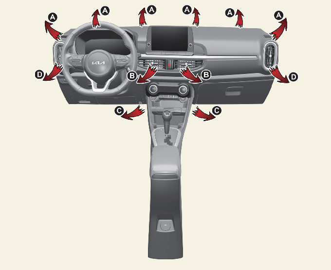 주로 발끝으로 바람이 나오게 할 때 사용합니다.(일반적으로 난방을 할 때의 위치입니다.)앞유리 습기 발생 예방 차원에서 (A), (D)방향에서도 약간의 바람이 나옵니다. |