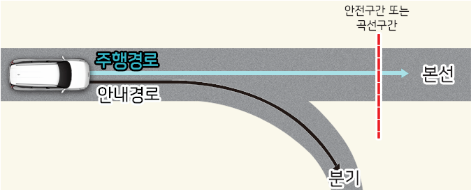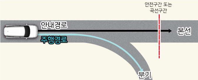 안내 경로(본선)와 주행 경로(분기)에 차이가 발생하면 전용도로 본선의 안전구간 또는 곡선구간 정보에 의해 고속도로 안전구간 자동감속 또는 고속도로 곡선구간 자동감속 기능이 일시적으로 작동할 수 있습니다.