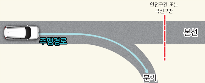 안내 경로(분기)와 주행 경로(본선)에 차이가 발생하면 주행 경로를 전용도로 본선으로 판단하기 전까지는 고속도로 안전구간 자동감속, 고속도로 곡선구간 자동감속 기능이 작동하지 않습니다.