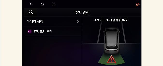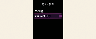시동「ON」상태에서 클러스터의 사용자 설정 → 운전자 보조 → 주차 안전 → 후방 교차 안전 또는 인포테인먼트 시스템의 설정 → 차량 → 주차 안전 → 후방 교차 안전을 차례로 선택하십시오. 후방 교차 충돌방지 보조가 켜집니다.