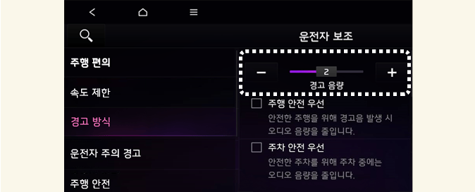 경고 방식을 변경하면 다른 운전자 보조 기능의 경고 방식도 같이 변경될 수 있습니다. 고려하여 변경하십시오.