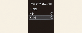 낮은 속도로 주행하거나 주변 차량이 적을 경우에만 경고 시점을 느리게로 설정하십시오.